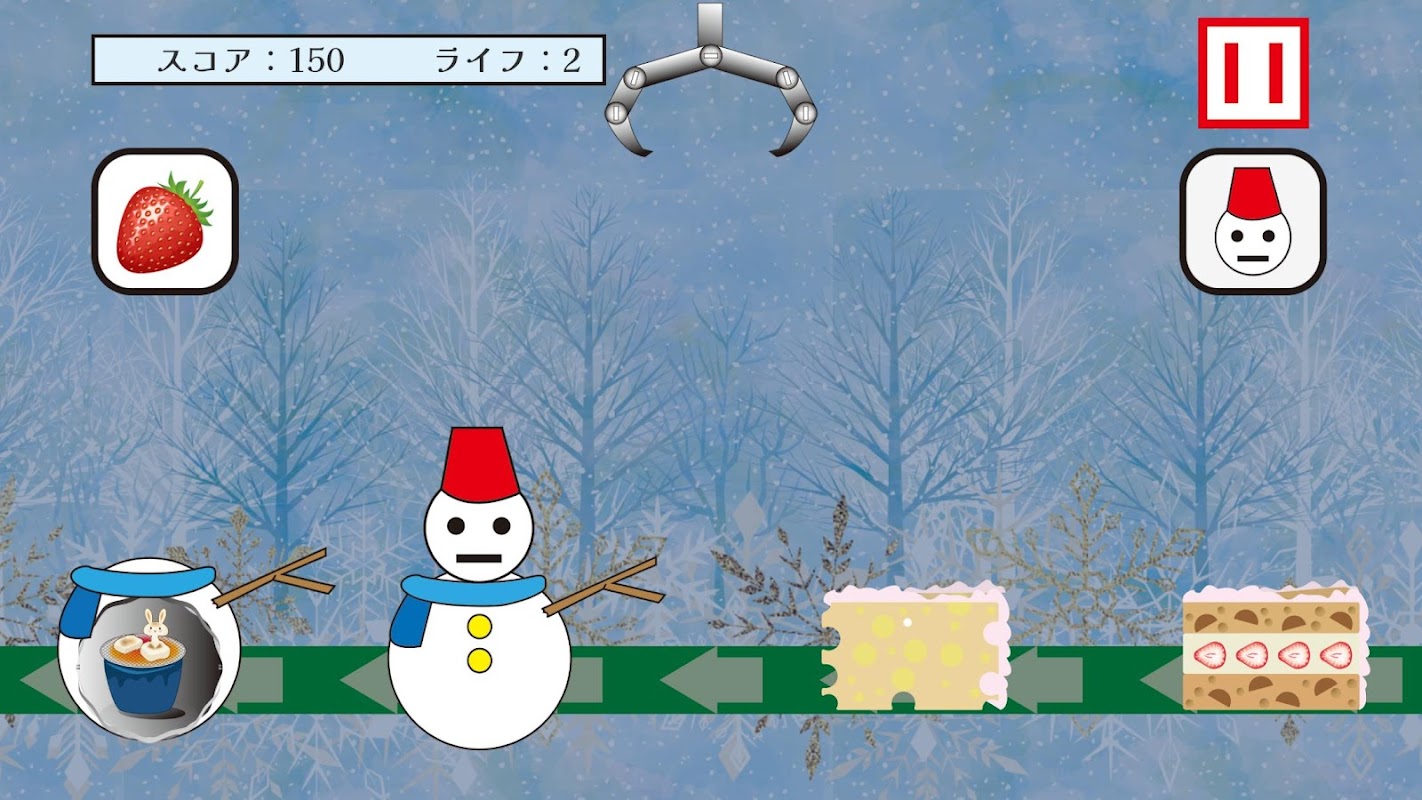 The flow of the game is that objects such as snowman heads and strawberries flow from the right to the left of the screen.