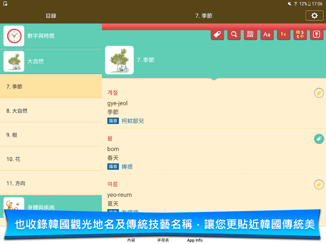 單詞均有加註羅馬拼音和中文諧音,是學習韓語發音最方便的工具。