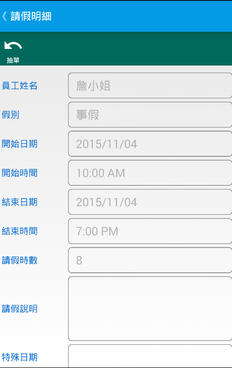 5. Persoonlijke speciale compenserende vragen: Gebruikers kunnen hun eigen speciale vakantie, compenserende bedrag dat beschikbaar is, gebruik te controleren.