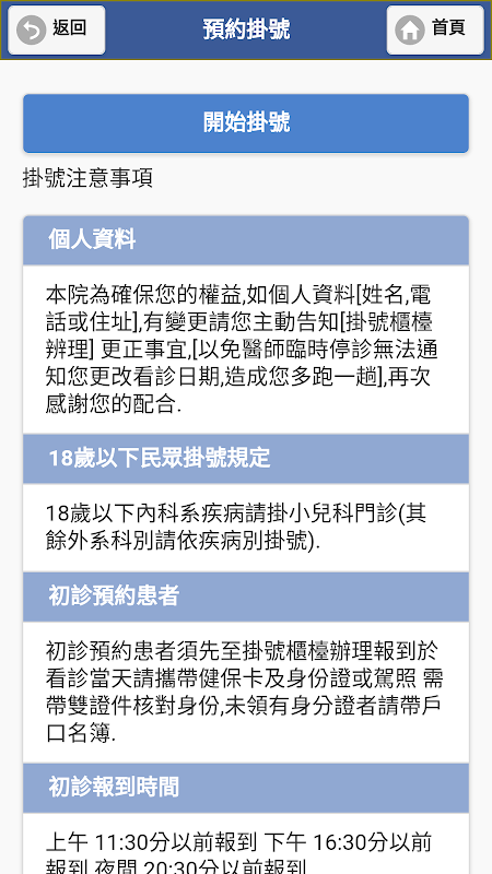 提供民眾來院門診看診掛號服務,可即時查詢門診班表與預約狀況,如預約是否額滿,門診停診與代診資訊等。