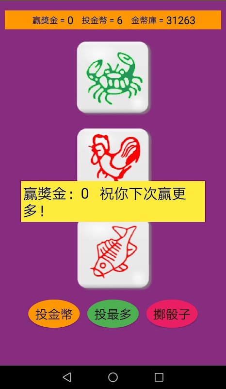 簡單的魚蝦蟹老虎機遊戲,可用來消磨零碎時間。遊戲具有逼真震動,還有仿真音效。每次擲骰子,就變換背景色一次。每擲出3個同形骰子,每個投幣可得300分;擲出2個同形骰子,每個投幣可得200分。可單次投幣,或一次投最多金幣。