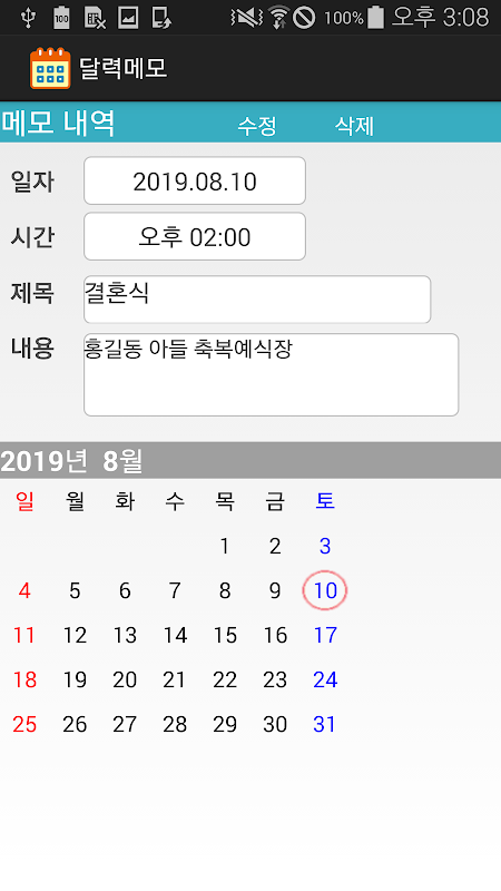 ㅇ 달력위에 간단한 메모 및 일정 기록