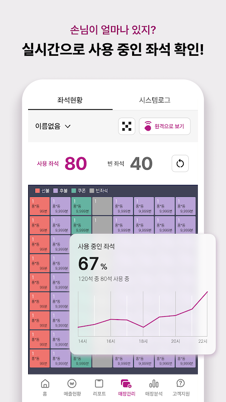 - U kunt de status van de zitplaatsen in de winkel in realtime controleren en eenvoudig het huidige pc-gebruikspercentage, bezoekersstatistieken per periode en systeemlogboeken bekijken.