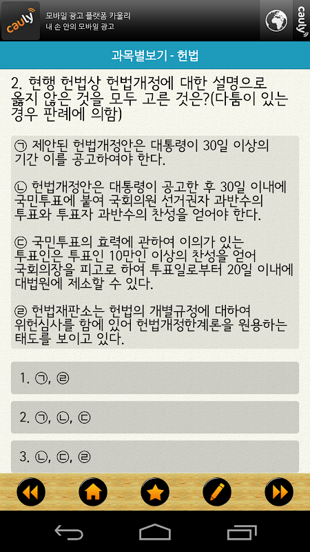문제를 풀면서 정답을 볼 수 있습니다. 또한 '*' 버튼을 사용하여 즐겨찾기에 추가가 가능합니다. 옵션에서 자동 진행을 선택하면 문제를 풀 때마다 다음문제로 자동 진행됩니다.