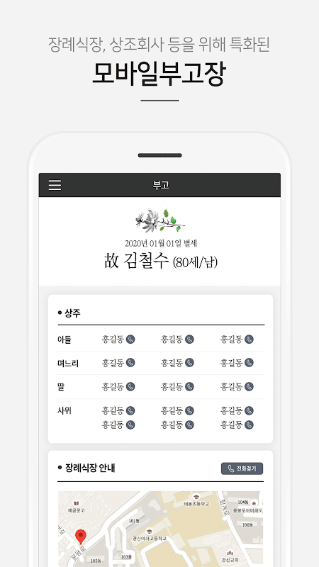 - 업체(장례식장, 상조, 단체 등)는 부고장(업체용) 앱을 이용하여 주세요.