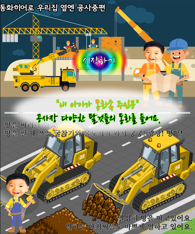 ★스마트폰에 내가 나왔으면~콘텐츠의 주인공이 바로 나!★ “내 아이가 동화속 주인공” 공사장 다양한 탈것들의 이야기를 들어요.