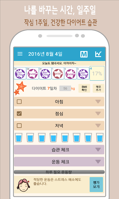 매끼의 식습관과 생활습관, 체중은 물론 하루에 마신 물의 양을 체크할 수 있습니다.