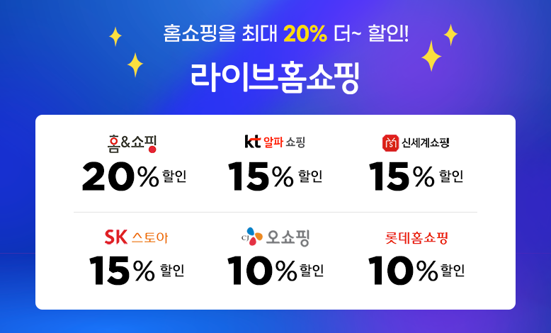 - GS Home Shopping (GS Home Shopping), CJ Home Shopping (CJ On Style), Lotte Home Shopping, Hyundai Home Shopping, Home & Shopping, NS Home Shopping (Landbouw en Visserij Home Shopping), I'm Shopping, KT Alpha Shopping , W Shopping, Shinsegae Live Shopping (Shinsegae TV Shopping), als u Shopping Entity via mobiel bestelt, kunt u tot 15% korting/besparing krijgen.