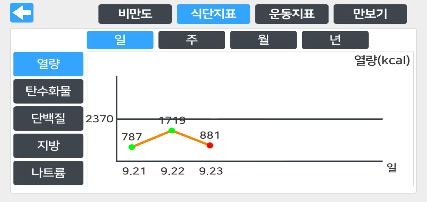 * 본인이 입력한 전체 데이터 확인 가능 - 비만도(BMI), 5대 영양소(열량, 탄수화물, 단백질, 지방, 나트륨), 운동, 만보기