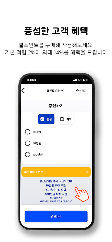 Als u bijvoorbeeld 1 miljoen gewonnen contant opwaardeert, wordt er 12% extra geaccumuleerd / bij het opwaarderen met een kaart wordt 9% extra geaccumuleerd, en wanneer een bestelling is voltooid, wordt er 2% extra geaccumuleerd, wat een korting oplevert van maximaal 14%.