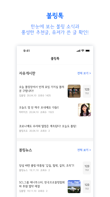 볼링톡을 이용해 ‘볼링 뉴스‘, ‘자유 게시판‘, ‘장터‘, ‘강습 모집 게시판’ 을 열람하고 작성 할 수 있습니다. 볼러들과 서로 소통하세요!