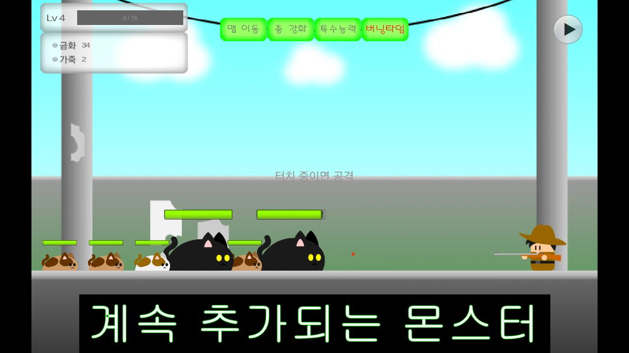 사냥꾼을 키워서 더 강한 몬스터를 사냥하자! 총을 강화하고 특수능력을 배워서 더 강한 사냥터로 나아가자!엄청나게 쉬운 사냥 방식의 키우기!