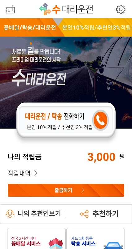 * 대리운전, 꽃배달,탁송, 법인대리운전 을 적립금 받으시면서 하나의 어플로 사용해보세요~