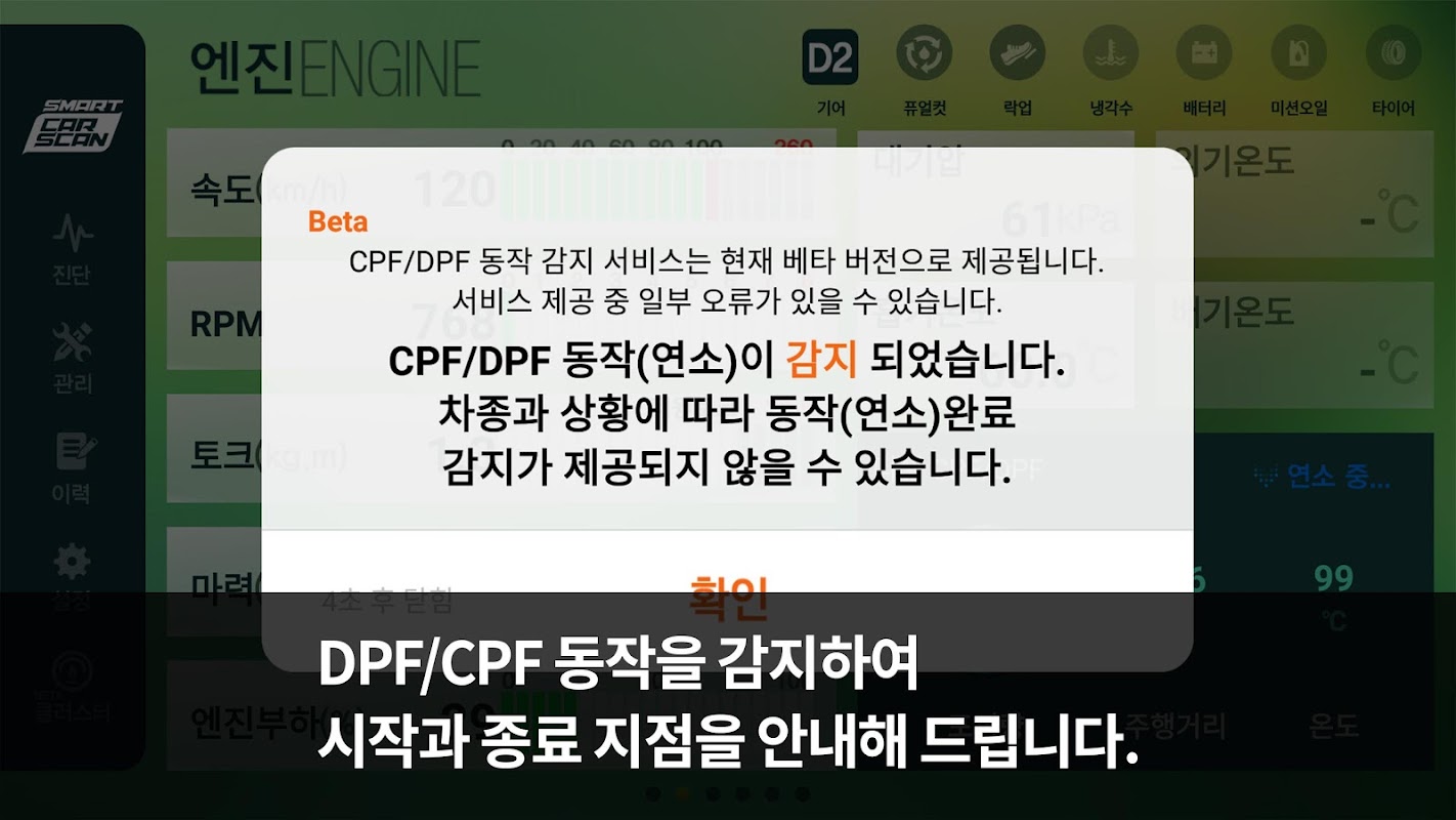 또한 엔진 부하율과 대기압, 흡기온도, 대기온도, 촉매온도, 디젤차량의 CPF, DPF 포집량 등을 제공하여