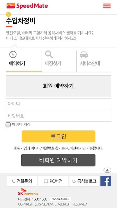 SK대표 자동차 종합 서비스 스피드메이트 모바일 웹사이트입니다. 타이어교환, 수입차정비, 예약하기, 매장찾기, 차량관리, 이벤트프로모션 등 이 모든 기능을 스피드메이트 모바일 웹사이트에서 편리하게 이용하시기 바랍니다