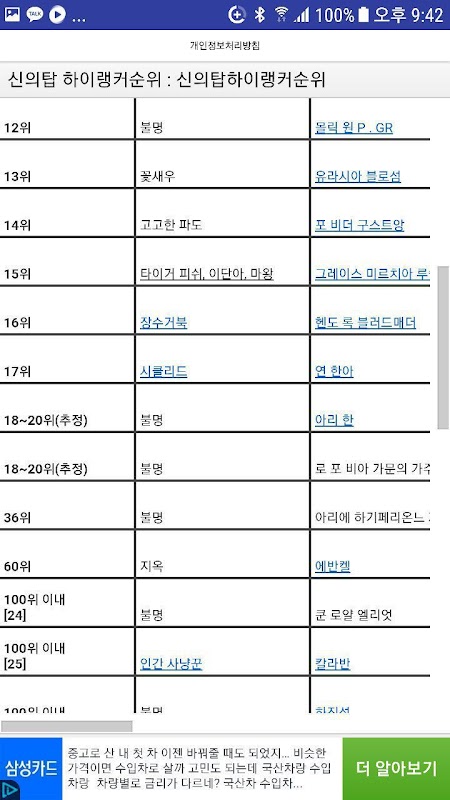 신의탑 하이랭커들의 랭킹정보와 자세한정보를 제공합니다.
