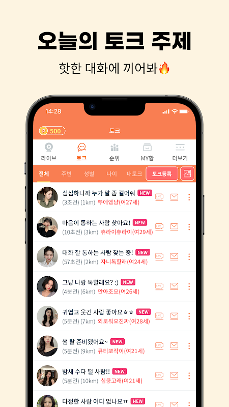 2. Talk: Dit is een prikbord waar leden zichzelf kunnen promoten via hun eigen berichten. Leden kunnen de berichten bekijken en een gesprek met de andere persoon aanvragen door een bericht te sturen.