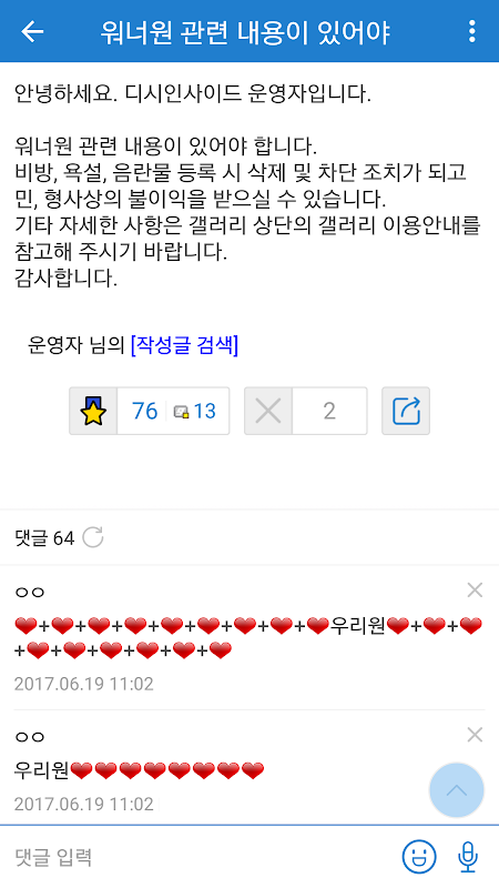 워너원 갤러리 앱은 국내 최대 커뮤니티 디시인사이드(dcinside) 갤러리 중 워너원 갤러리에 특화되어 있는 앱입니다. 갤러리 바로 접속, 커버 이미지, 추천 수 필터링 기능, 연관 디시콘 등 특별한 기능을 제공합니다.