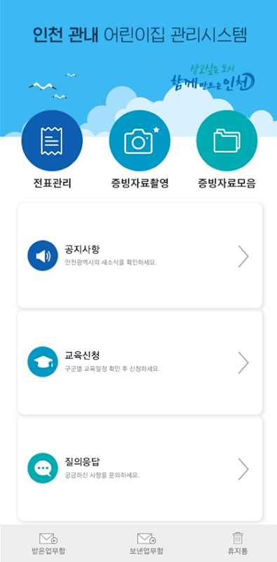 Biedt een functie om bonnen voor aankopen van kinderdagverblijven te registreren en te beheren, en om trainingsschema's voor het beheersysteem van kinderdagverblijven in Incheon te controleren en aan te vragen.