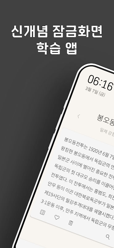 Op het moment dat je je smartphone aanzet, ontvouwt zich een pagina uit de Koreaanse geschiedenis. Je kunt de Koreaanse geschiedenis onder de knie krijgen zonder extra tijd te besteden. Profiteer van de gewoonte om tientallen keren per dag uw smartphone te controleren en maak van die vrije tijd een leermoment.