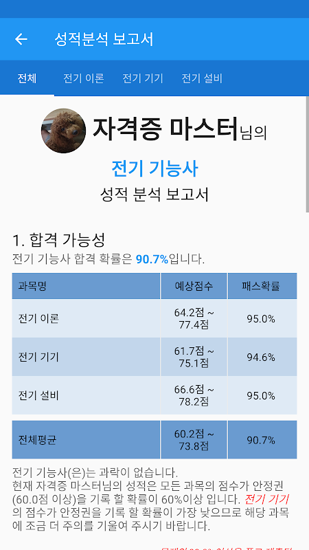 성적확인 - 각 과목별 성적 및 그동안 풀어본 기출문제와 모의고사, 문제풀기의 성적을 볼 수 있습니다.