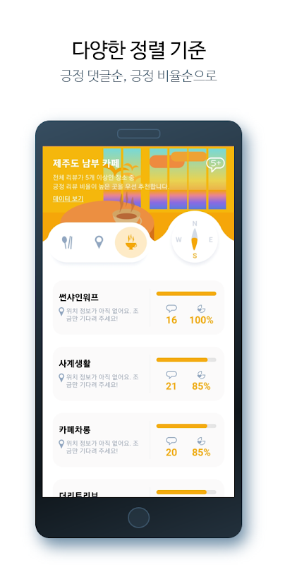3. U kunt restaurants, toeristische attracties en cafés in de omgeving controleren op basis van verschillende sorteeropties (pictogram in de rechterbovenhoek), inclusief de volgorde van het hoogste percentage positieve reacties.