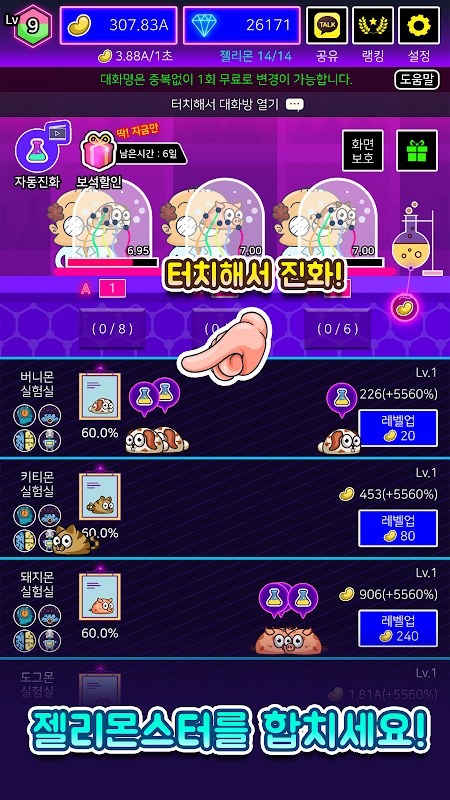 새로운 기술과 인공지능을 도입해서 새로운 젤리몬을 부화하고 더 많은 젤리를 모으세요.