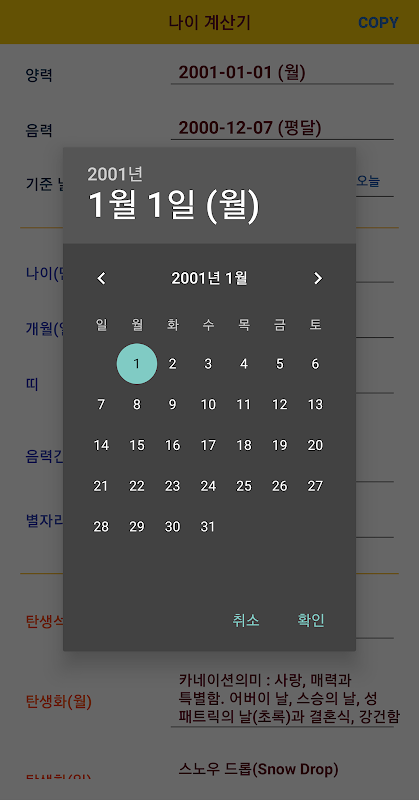 양/음력 날짜에 따른 나이 계산용 앱. 육십간지, 띠, 별자리, 탄생석, 탄생화(월), 탄생화(일), 탄생목 등의 추가 정보를 제공.