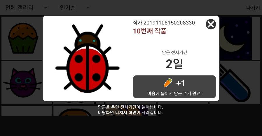 그린 그림을 자랑하여 당근을 받을 수 있으며, 캡쳐를 하여 갤러리에 저장 할 수도 있습니다!