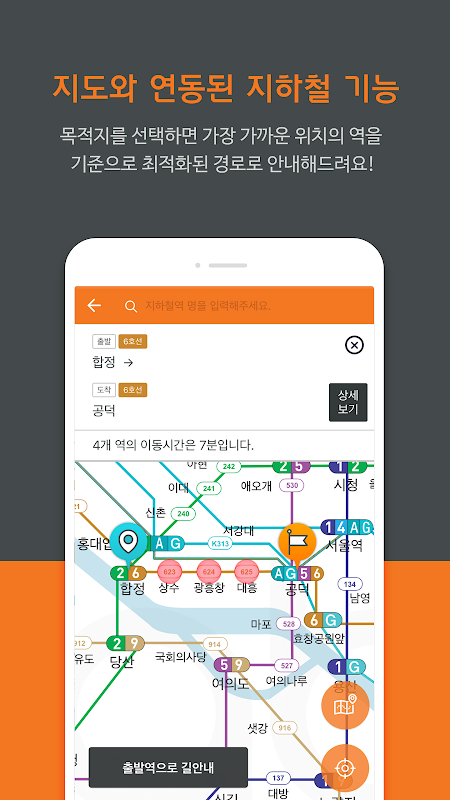 목적지를 선택하면 가장 가까운 지하철역을 기준으로 최적화된 경로를 안내합니다.