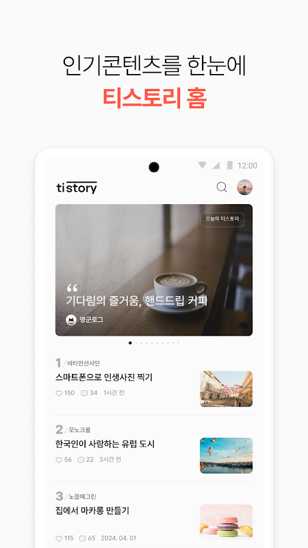 Tistory biedt een verscheidenheid aan inhoud van populaire blogs. Mis niets van alles, van populaire artikelen in categorieën waarin u op interesse kunt bladeren, tot makers van verhalen in elk vakgebied en bedieningstips voor Tistory-beginners.