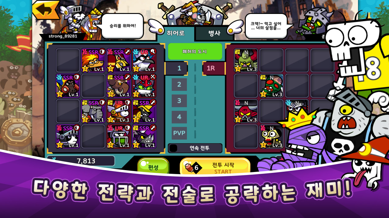 스테이지마다 자신만의 유리한 스킬을 구성, 소환, 공격, 지원 타입의 스킬을 전략적으로 플레이할 수 있습니다!