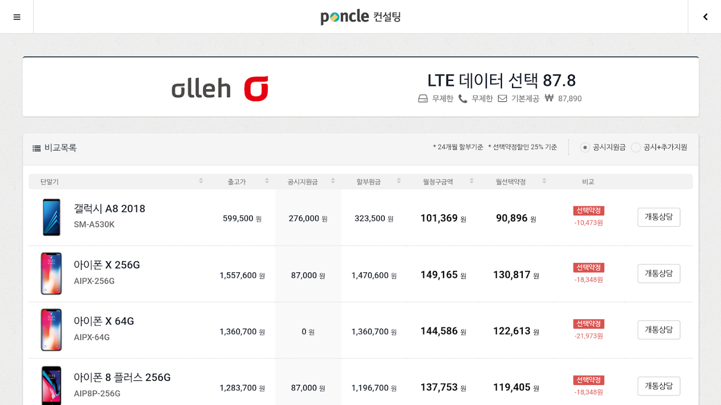 - 통신사, 요금제를 선택하면 모든 단말기를 한 화면에서 비교