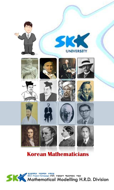 성균관대학교 수학과 BK21사업 수학적모델링 분야 핵심인재양성사업단에서 디자인 등록한 수학자카드 포스터 중 한국 수학자들을 스마트폰에서 학습할 수 있도록 한 교수학습자료로써 한국의 수학자들에 대해 알 수 있도록 만든 e-book 형식의 어플리케이션입니다.