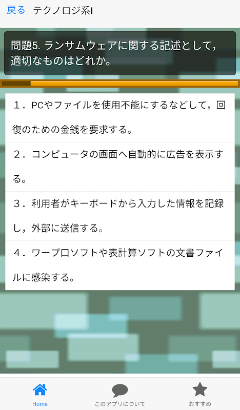 国家試験の「ITパスポート」の平成28年春期試験問題からの抜粋版です。設問数をあえて減らすことで、ちょっとした通勤通学などの隙間を活用して手軽に学習できます。