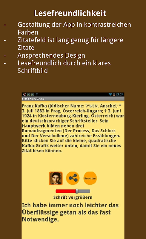 Sie möchten gerne mehr über den jüdischen Schriftsteller Franz Kafka erfahren? In dieser App können Sie 50 seiner besten Zitate nachlesen, in den sozialen Netzwerken teilen und per E-Mail versenden. Die App wurde von einer Muttersprachlerin entwickelt und lektoriert. Damit Sie immer das passende Kafka Zitat schnell zur Hand haben! Sprache der App: Deutsch.