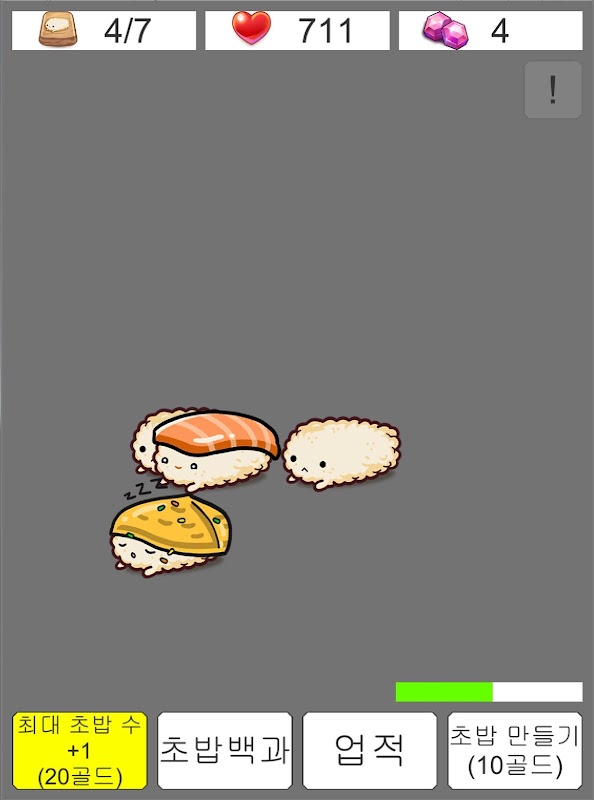 같은 초밥 두개를 합쳐 새로운 초밥을 만들어가자! 만들 수록 더 귀한 초밥이 나타난다! 초밥대백과를 채우자!