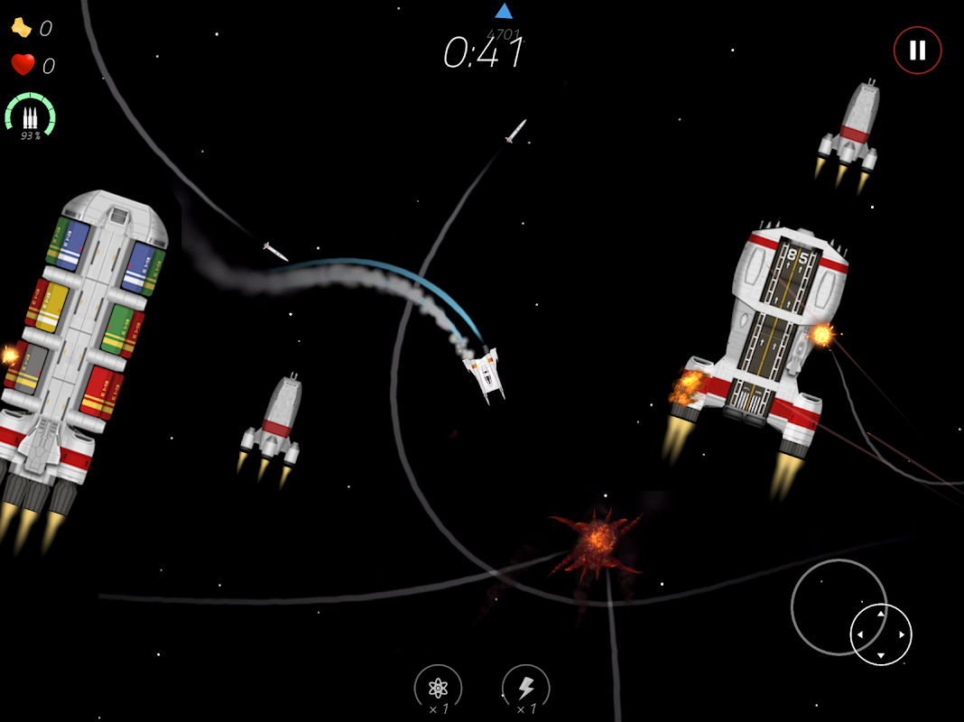Gebruik bonussen zoals beschermingsschilden, ruimtewapens, EMP (elektromagnetisch veld), Speed Boost en andere power-ups om raketten te vernietigen en te ontwijken.