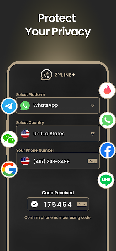 - Opties voor tweede nummers voor sms-/OTP-activering: Gebruik 2nd Line+ voor sms-verificatie en eenmalig wachtwoord (OTP) met onze virtuele nummers. Ideaal voor veilige sms-activering op platforms zoals WhatsApp en Telegram. Onze sms-app maakt het gemakkelijk om virtuele sms-berichten te ontvangen en te versturen.