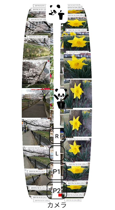 - 軽いタッチで画面をスクロール(上下動)させ立体的回転させて写真をみることができます。