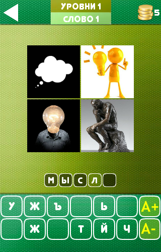 4 фото 1 слово - увлекательная головоломка для всей семьи! 4 изображения - угадайте какое слово они обозначают. Необходимо ввести слово, которое соответствует всем картинкам. Будьте внимательны, есть уровни, как простые так и с подвохом! Игра имеет несколько подсказок: «Открыть одну букву», «Спрятать лишние буквы». 4 фото 1 слово - хороший способ проверить уровень ваших знаний, интеллекта и абстрактности мышления. Вам точно не будет скучно!