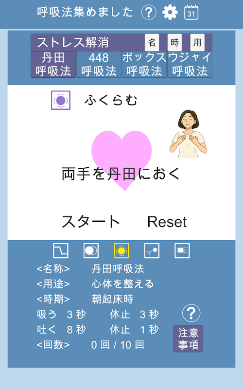 Deze app ondersteunt je bij het oefenen van ademhalingstechnieken, zoals het tijdstip van inademen, stoppen en uitademen, het aantal ademhalingen en de ademhalingshouding. Momenteel zijn er 13 populaire ademhalingsmethoden ingesteld.