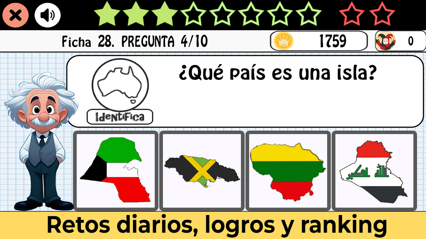 Ontgrendel gebieden op de kaart door vragen correct te beantwoorden en klim in niveaus met dagelijkse uitdagingen, prestaties en ranglijsten.