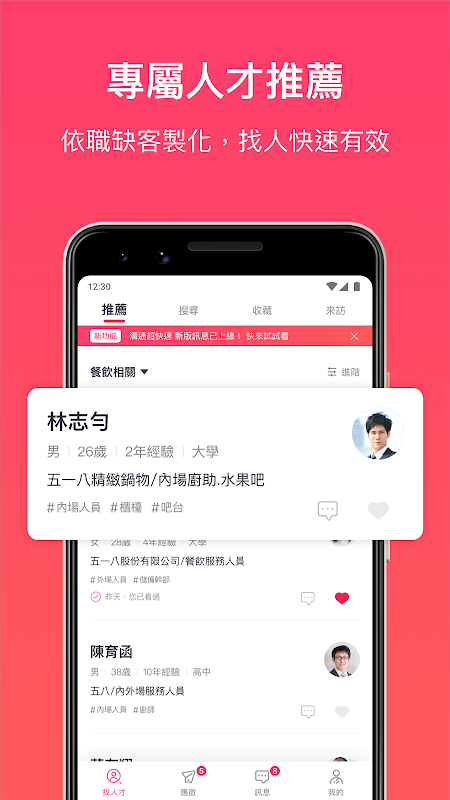 專為服務業招募、徵才設計,使用隨身攜帶的手機隨時找人才,即時接收最新應徵通知,提升招募的效率。