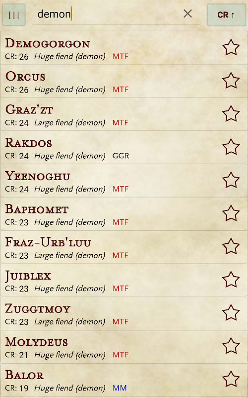 Quickly sort by CR (Challenge Rating) or Name using the top-right button.