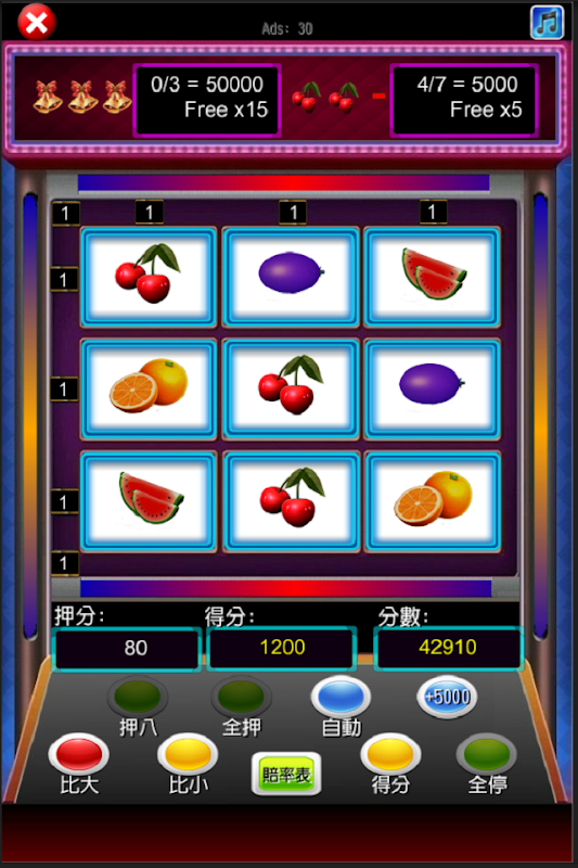 共有九個轉輪,讓您享受真實的水果機台遊戲,體驗以小博大的刺激感
