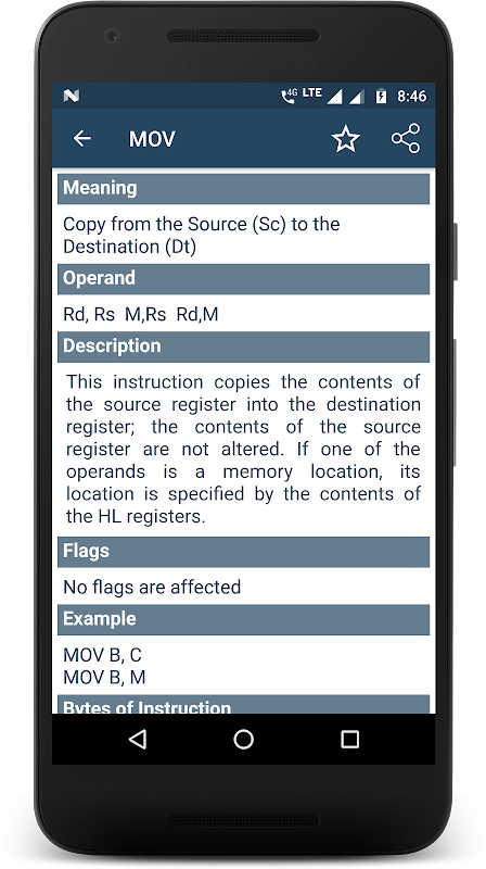 8085/86 Opcodes is een app die alle instructieset of opcodes van 8085 en 8086 microprocessor bevat. Hier bevat opcode-detail informatie zoals de betekenis van opcode, operand (16-bits adres of meer), korte beschrijving van opcode, vlaggen die worden beïnvloed tijdens het gebruik van de opcode, voorbeeld dat laat zien hoe opcode moet worden gebruikt, bytes die nodig zijn om de instructie / opcode te gebruiken, machinecyclus (m-cycle) en t-state vereisen het gebruik van de instructie/opcode. Het raadplegen van montage-instructies was nog nooit zo eenvoudig.