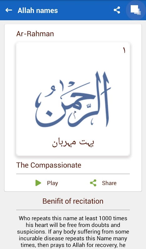 Finally an app that helps you to learn and memorize the 99 names of Allah and names of Prophet (P.B.U.H.). The amazement does not stop there this app also helps you remember the meanings of each name of Allah and benefits of recitation .