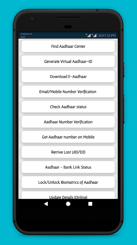 Aadhar Online Service is an Android Application which makes you to easily Modify, Update, Apply, Scan and Download Aadhaar Card at Finger Tips.