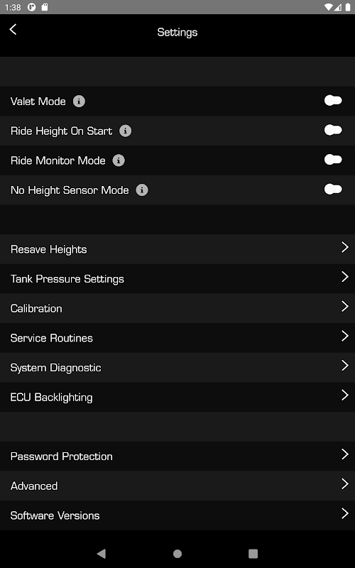 Met onze nieuwe Valet-modus heb je nu de mogelijkheid om de systeemfunctionaliteit te beperken tot alleen positie 2 en 3, met RideMonitor en Ride Height on Start geforceerd aan. Deze instelling kan alleen worden in- en uitgeschakeld vanuit de e + mobiele applicatie.